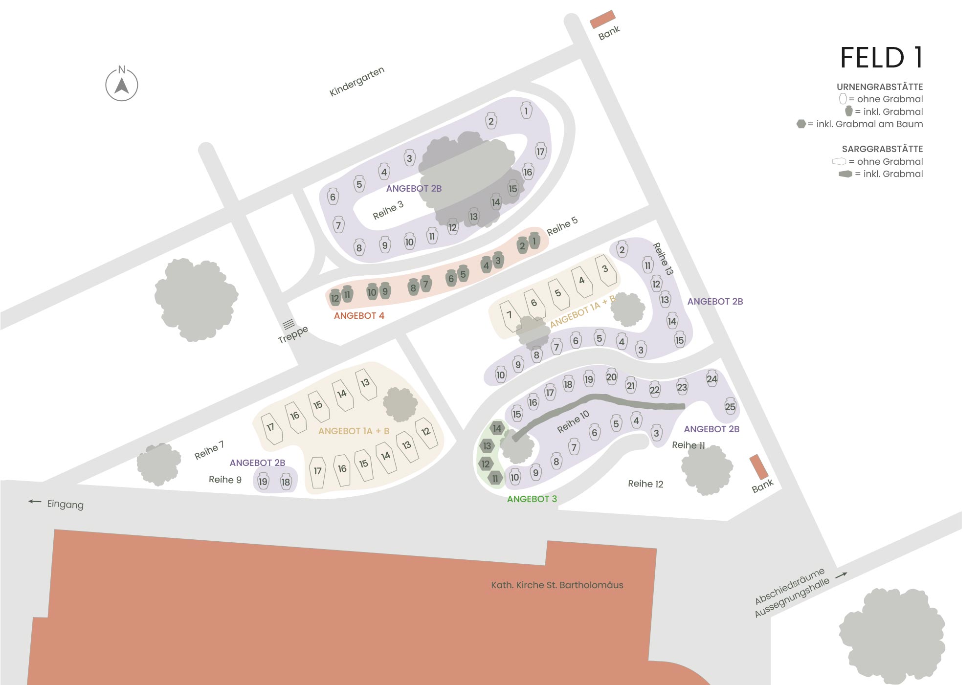 | Bis zu 4 Urnen pro Grabfläche | Bis zu 2 Sargbestattungen + bis zu 4 Urnen pro Grabfläche | ||