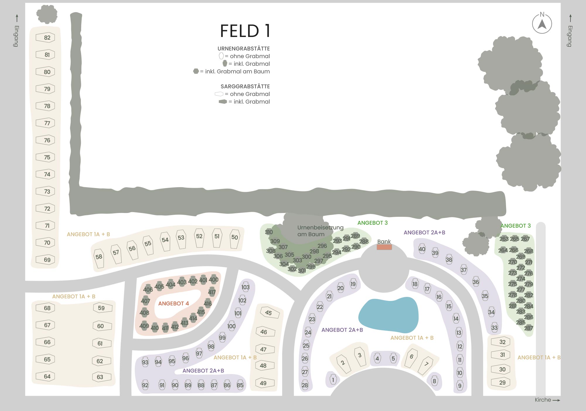 Die naturnahen Beete werden über das Jahr hinweg saisonal bepflanzt, wodurch sich das Erscheinungsbild im Rhythmus der Jahreszeiten wandelt (1B). Alternativ besteht auch die Möglichkeit einer dauerhaft grünen Bepflanzung, die das Grabfeld das ganze Jahr über in Ruhe und Frische erscheinen lässt (1A).