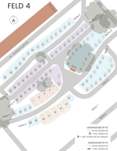 Individuell, ruhig gelegen, natürlich gestaltet. Am stillen Rand des Friedhofs, eingebettet unter altem Baumbestand, bietet dieses Grabfeld eine ruhige, geschützte Atmosphäre, offen zugleich für Begegnung, Erinnerung und Innehalten. Hier wählen Sie den Platz Ihrer Grabstätte frei und stellen Ihr individuelles Grabmal nach eigenen Vorstellungen auf.