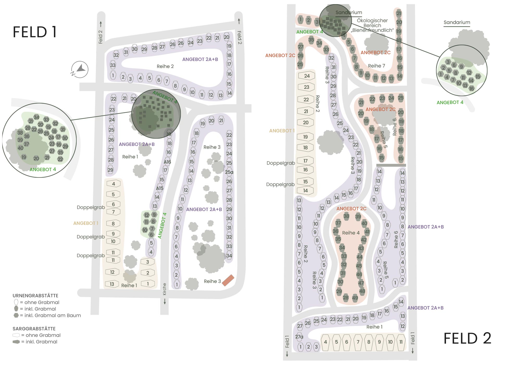 Alle Grabstätten sind mit dauerhaft grüner, insektenfreundlicher Bepflanzung (2A) umgeben, die das ganze Jahr über für Beständigkeit, Frische und eine naturnahe Ausstrahlung sorgt. Auf Wunsch kann ein saisonales Blumenbeet (2B) ergänzt werden, das im Rhythmus der Jahreszeiten blüht – von zarten Frühjahrsblüten bis zum leuchtenden Herbstlaub.