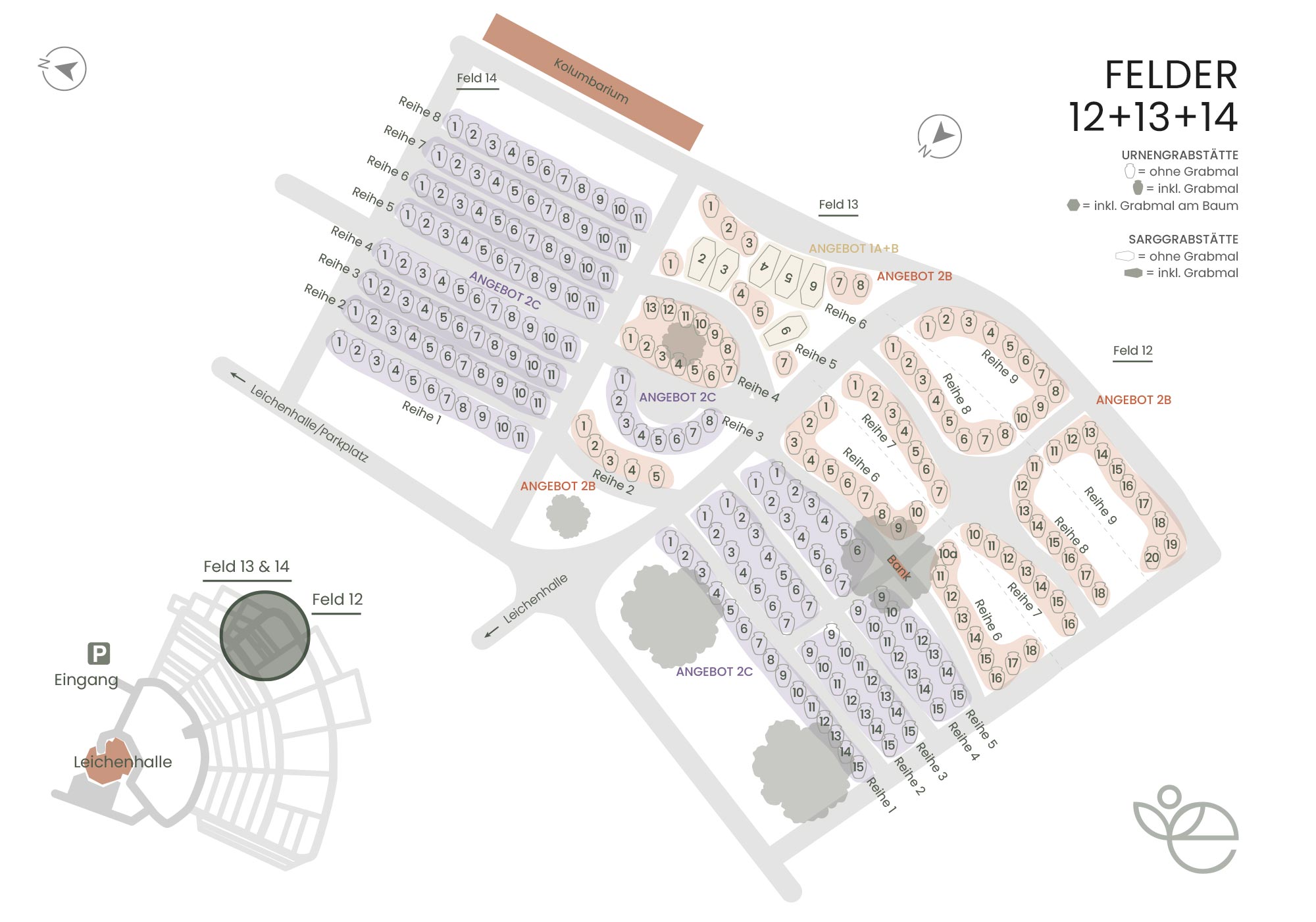 Das Grabfeld wird dauerhaft grün bepflanzt (1A) und vermittelt so Ruhe, Frische und Beständigkeit das ganze Jahr über. Alternativ besteht die Möglichkeit, ein saisonales Blumenbeet zuzubuchen, das mit wechselnden Farben und Blüten einen lebendigen Augenschmaus schafft (1B). Im Beet eingelassene Steine schaffen Platz für Blumen, Gaben oder Symbole des Gedenkens. Jede Grabstätte ist eingebettet in eine Umgebung, die Ruhe, Beständigkeit und Naturverbundenheit ausstrahlt.